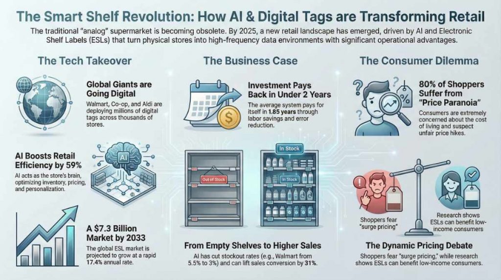 The physical retail landscape at the close of 2025 has ceased to be a separate entity from the digital world, becoming a high-frequency data environment. The industry has reached a point of no return where the traditional «analog» store is seen as an operational disadvantage compared to the new global infrastructures led by Artificial Intelligence (AI) and Electronic Shelf Labels (ESL).